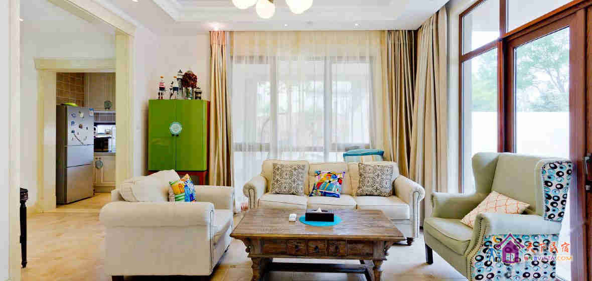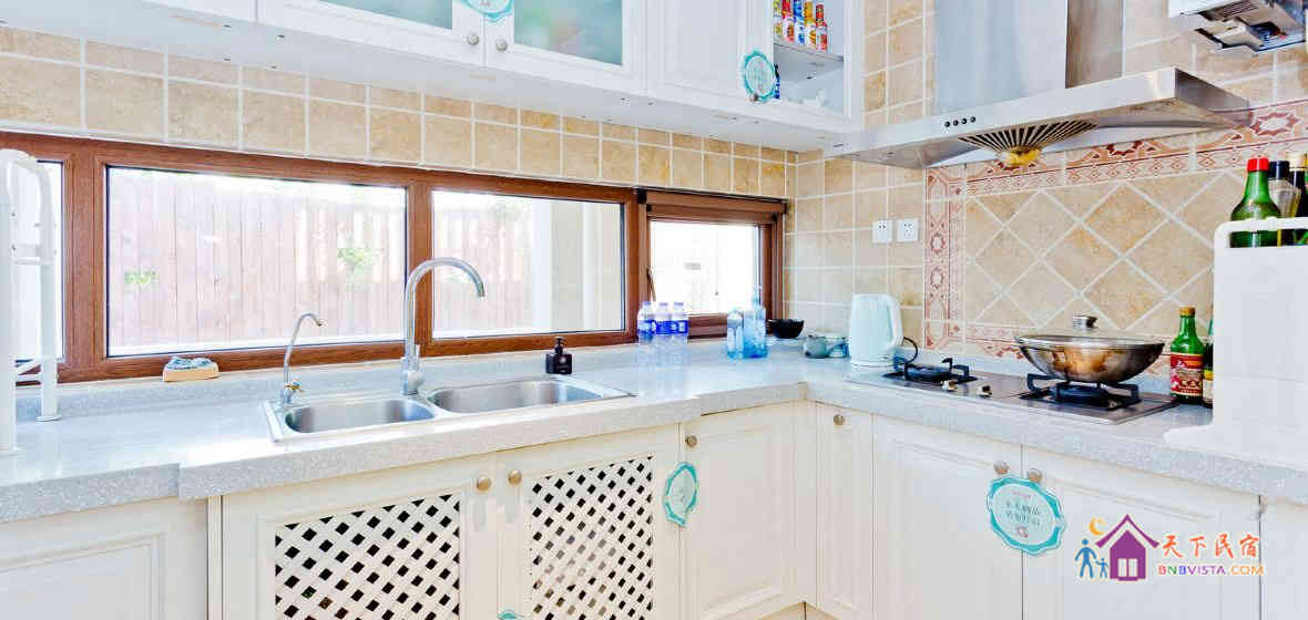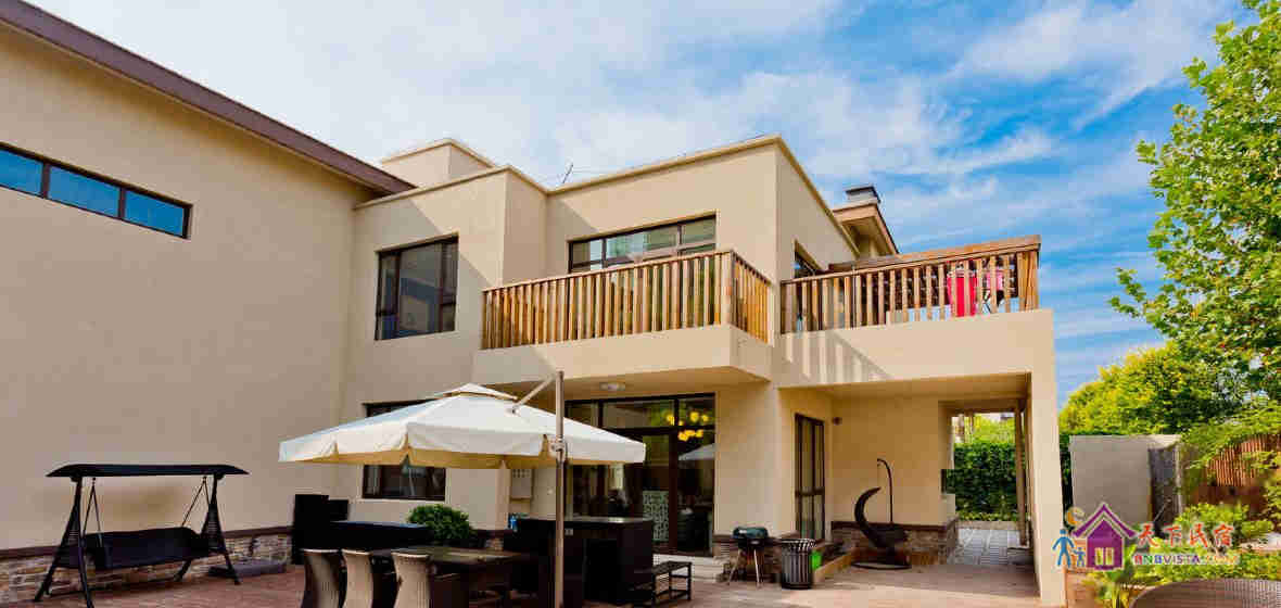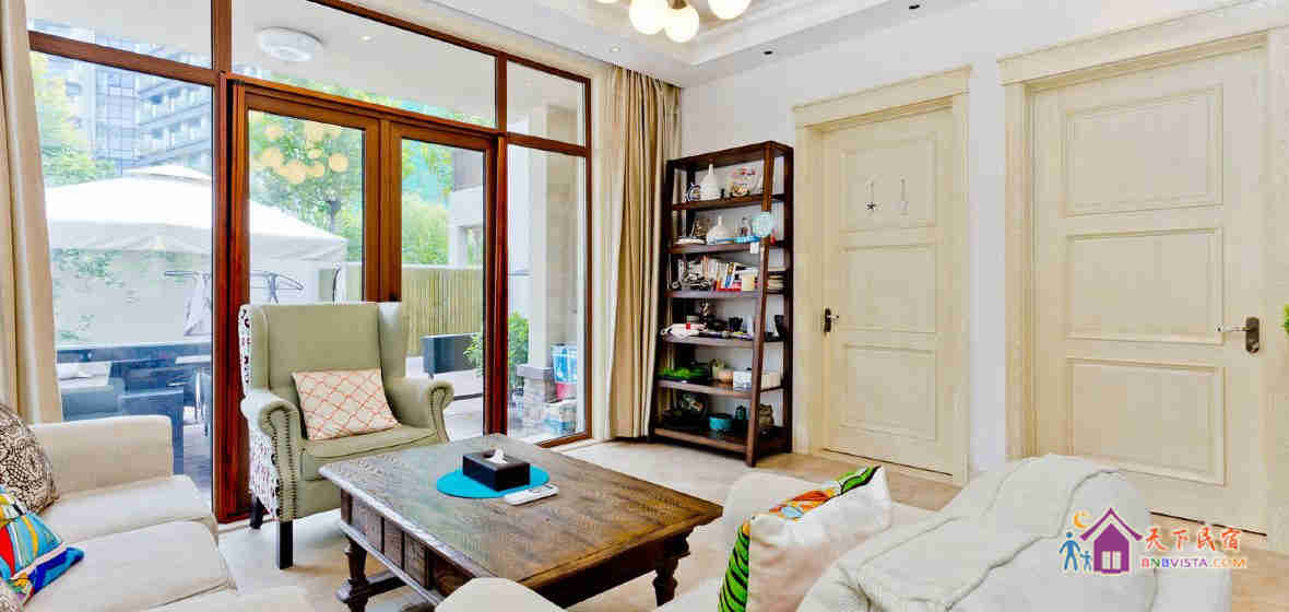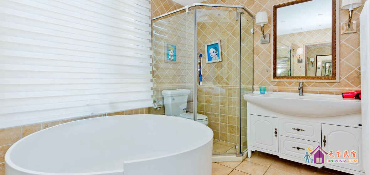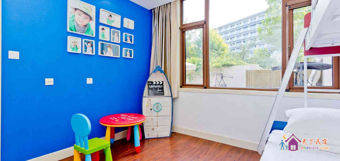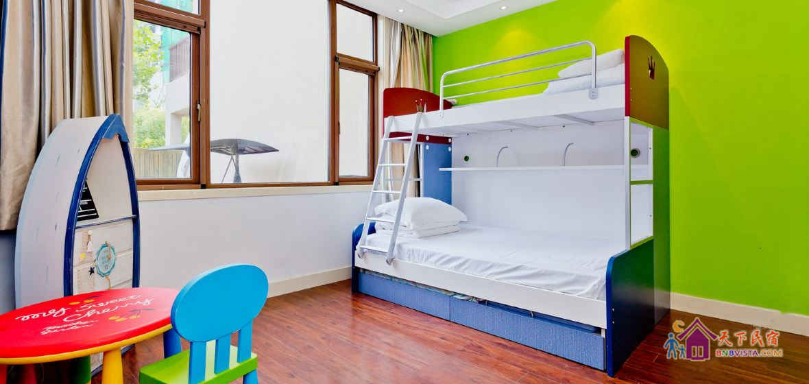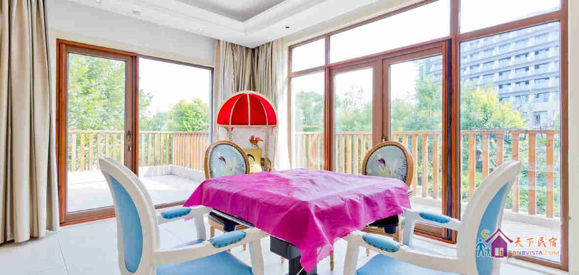 户型:两层别墅,两厅(客厅、多功能娱乐厅)、三室(两张1.8×2米大床,一张1.35×2米儿童高低床)、两卫(楼上主卫带超大圆形浴缸)。最多可住6大3小(8岁以下,8岁以上按成人计)
