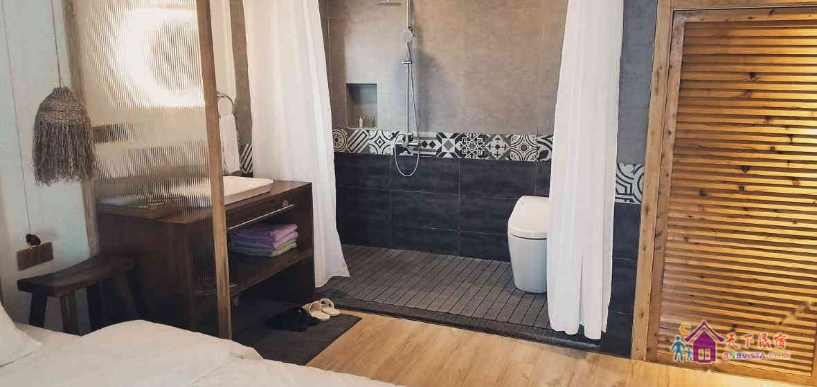 二楼则是五间客房,有大床房,亲子房,双人房,每间房都是推窗见景,每间房都有各自的风格,但整体有一种自然放松的感觉。客房的露台上有木桶浴缸,夜里放满一缸水,躺在桶里数星星或是发呆,能让人放松到酥软。