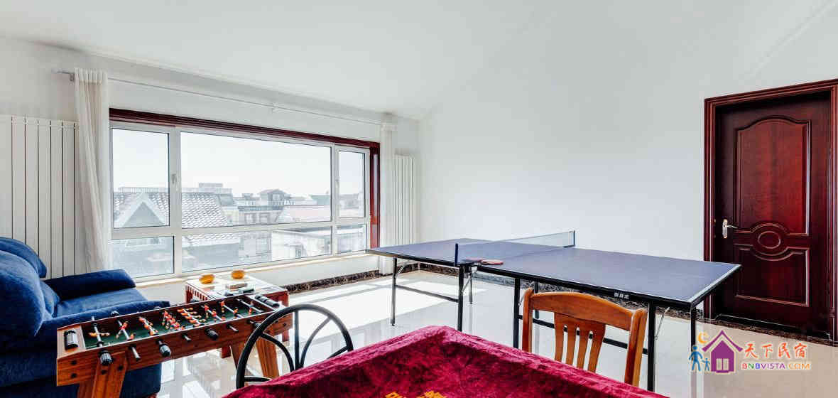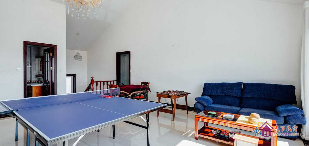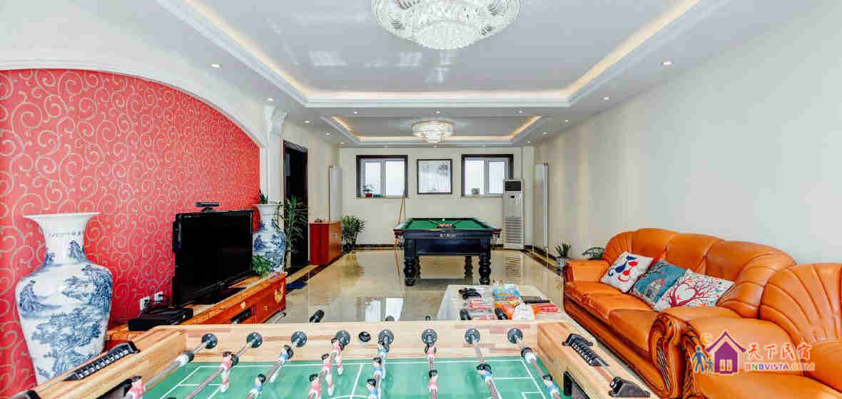 别墅娱乐设施齐全,有标准十六彩台球桌,桌上足球,乒乓球桌(配备乒乓球拍),KTV,麻将桌,各类桌游,棋牌等应有尽有,想玩就玩,想唱就唱!