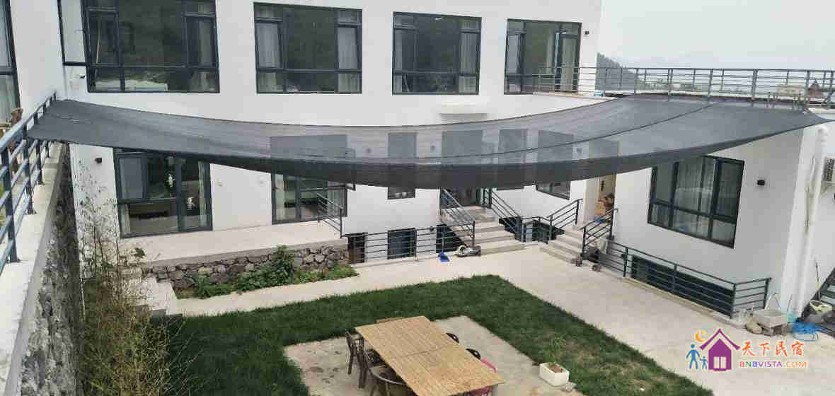 房子:依山而建,高低错落,中央美院教授建筑设计,简约现代装修,阳光和风在屋子里流动,500平米建筑面积,仅有客房9间,最多接待成人20人,并配多个儿童床,有公共客厅、餐厅、小客厅,并可享受美好院落及露台,管家阿姨负责卫生和做饭,少油少盐采用自家有机的猪肉、鸡肉、鸡蛋、蔬菜等食材。从院子拾级而上,西坡、北坡种植各种水果,山顶可远眺村景,坡下是散养的芦花鸡和柴鸡,鸡舍下有三片梯田,种植各种新鲜蔬菜和香草,还有苹果、枣、杏和西瓜等水果。
