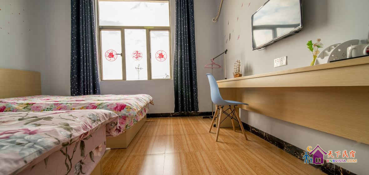 涠洲岛秦陇阁苑客栈房间设施齐全,2床上用品为三秦风格的纯棉布材质。