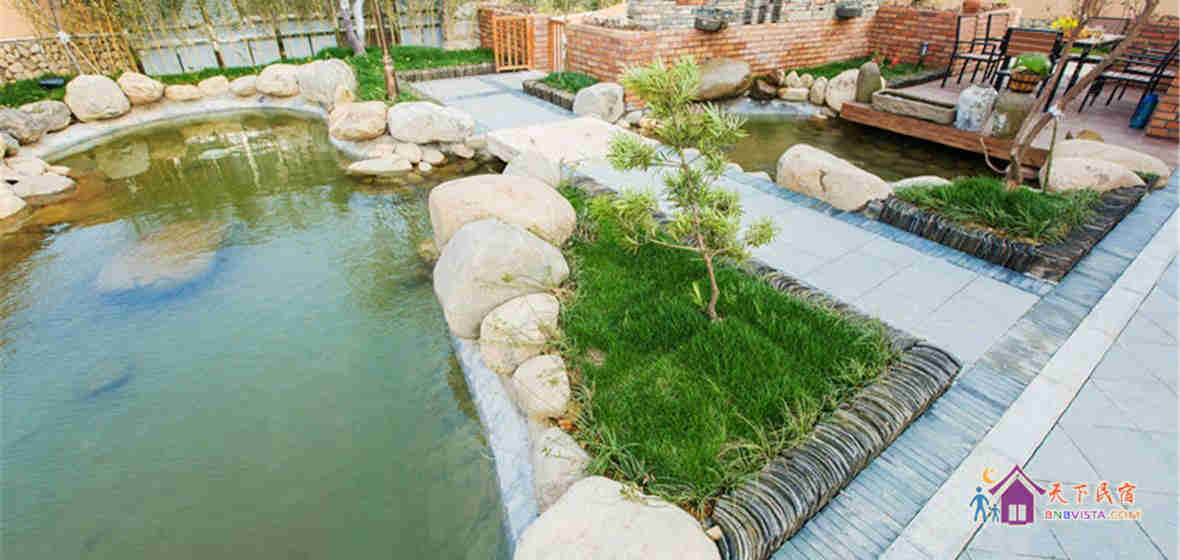 黑瓦白墙,青石老木,翠竹掩映。露天的庭院方正,流水淙淙、错落有致,花花草草甚是可爱。庭院中有各种小憩的设施,或听风品茶,或饮酒赏月,或三五老友烧烤小聚,或来一场酣畅淋漓的好友派对,再惬意不过。