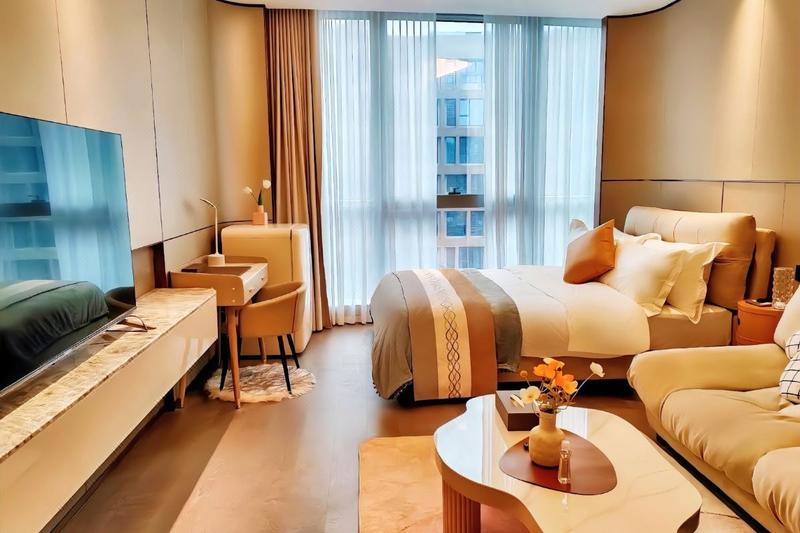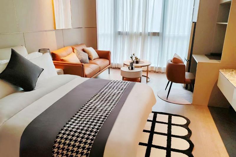 位于成都金融城核心地带天府二街,近金融城、环球中心、世纪城新会展中心,商场、商务区、交通枢纽都汇集在此处,是商务出差和旅游出行的优选。内设有24小时免费停车位,为您畅快的自驾提供便利。我们有商务大床房和套房两种房型。180°-270°玻璃幕墙可观赏桂溪生态公园、环球中心、天鹅湖公园湖景。室内提供高端配套设施:全屋智控、中央空调、高速免费的无线Wi-Fi、高清液晶电视、洗烘一体全自动滚筒洗衣机、整体厨卫、智能马桶、免费MiniBar等。入住期间全程提供管家式服务,让您感到宾至如归,为您带来“诗意的旅居生活”体验。