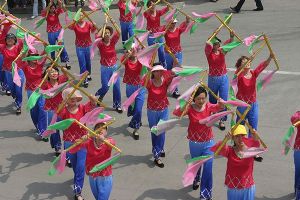 道具的运用是该舞的主要特点之一。舞者穿梅红色上衣,天蓝色裤子,黑布鞋。取一根80厘米左右长的青竹棒,在竹棒的两端挖一个长15厘米长方形的孔,在孔芯内用小铁丝串上两档铜丝,每挡铜丝十至十二枚铜钿。在竹棒上粘上金色即时贴,两头栓上正方形彩色绸布。表演自始至终不能离开它。一系列的舞蹈动作是紧紧围绕莲湘棍而展开的。不管是手打莲湘,还是脚踢莲湘,都要使莲湘上的铜钱发出一连串清脆的响声,以增添明快的节奏和特色。身体重心的移动和双肩主动凑向花棍形成的动肩是该舞的上要韵律。肩与莲湘互相碰击,动作爽朗。章或举棍吸腿一跳,形成了高低缓急的对比。因此,整个舞蹈使人感到既灵活,清晰,又流畅、连贯。 天下民宿