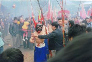 “梅山七圣”同时还是各种傩戏、傩祭中扮演表现的对象,而在傩戏、傩祭中,“驱鬼“是一个仪式的重要主题,因而傩戏、傩祭中有狞厉骇人的装扮形象,夏坊村的游傩也是这类习俗的一种衍伸。夏坊村的游傩习俗中,每个神傩的装扮都有固定的模式:“一圣”红脸,头扎绿巾,头上V形缺口处置一把锯子,上身1,下着黄裙;“二圣”以下都是黑脸,头扎红巾,也是1上身,但“二圣”、“三圣”都是头上置一把砍肉刀,下身着黄裙;“四圣”、“五圣”则腹部插一把利刃,直透后背,肚肠流出,下身着蓝裙;“六圣”、“七圣”左手腕各插一把匕首,下身亦着蓝裙。由于吴姓供奉“梅山七圣”的历史最久,“七圣”中的“一圣”,必定要由吴姓人来扮饰,游神时也是走在队伍的最前面。 Copyright BNBVISTA.COM
