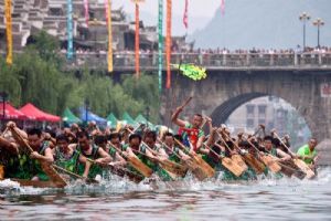 每年的端午节凤凰古城都会举行龙舟竞渡,一般前后3天,是一年凤凰人最隆重和最热闹的事情,比赛场地在凤凰古城沱江回龙阁繁华地段。这里的赛龙舟最大的特点是保留了传统的龙舟比赛形式,每年参与凤凰古镇赛龙舟比赛的队伍都有数十支,按照淘汰制原则选出最优秀的队伍。比赛当天每个苗家寨子都会派出最精壮的汉子参加竞渡,河里游弋着几条龙舟,称之为红龙、黄龙、白龙和乌龙。很多外地的游客都会慕名前来参观这声势浩大的龙舟比赛。