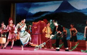 丰顺县潭山镇凤坪村,居住着梅州市唯一的少数民族——畲族,畲族婚嫁礼仪有“拦赤郎”、“中堂对揖(捡田螺)”、“借镬(猜谜)”、“以歌敬酒(俗称撬蛙即分红包)”四个环节,场面热闹,充满情趣,图为娶新娘中“拦赤郎”场面,描述迎亲队伍挑着礼担来到新娘寨门前,被一群女性以杉树刺拦住对歌。