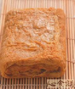 4.将煎好的厚蛋自锅中取出,再用竹帘整形成长方形,待定型后切块即可。