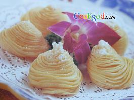 吴山酥油饼是用油面迭酥而成。它上尖下圆,形似一座金色的山峰,盖上的绵白糖,又如山顶上的皑皑白雪。吴山酥油饼不仅形美,而且脆而不碎,油而不腻,又香又甜,八嘴酥软,深受中外宾客欢迎。