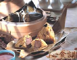 (5)每2张粽叶叠折起,先放入1大汤匙作法(3)拌炒好的糯米馅,再放入1块煮熟的牛肉块,再将糯米馅填满,包起用棉线绑好,放入蒸笼大火蒸10分钟即可。