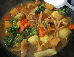 最后将速冻鱼丸、西兰花小朵、苹果块和樱桃番茄放入,大火煮沸后改小火煲10分钟。