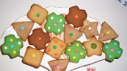 三,用镊子将想装饰的小星星和巧克力豆M&N放上粉坯,轻轻压下,在预热好了的烤箱250--300F烤13--15分钟(看粉坯的厚薄而定),时间到后取出晾开。其他的面团做法如此类推。