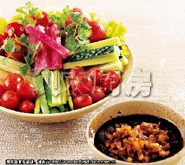将生菜铺在大圆盘中,心里美萝卜条、黄瓜条、尖椒条、香葱白段成放射形码放在生菜上面,中间点缀香菜叶、樱桃西红柿和樱桃小萝卜,将肉酱调味碟放在大盘中间,吃的时候取蔬菜条蘸食即可。