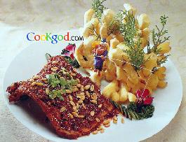 做法:通脊肉片3片,用刀拍松,撒上盐、胡椒粉腌渍,将奶酪...