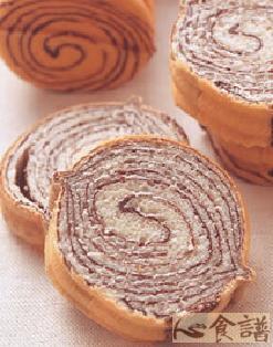 5.将作法4捲起成模型的厚度,再切成模型的宽度后,放入模型中,移入发酵箱,以温度38℃、湿度85%进行最后发酵约45分钟后取出,表面划开二刀,入炉烤焙,以上火200℃,下火180℃,烘焙约20分钟即可。