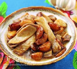 稍微加热下入葱丁,倒入切好的肚条进行翻炒,再加入酱油、料酒、盐、白糖、姜、鸡精,翻炒几下以后倒入炸好的蒜粒,加少许水焖烧一会。