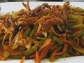 做法:1、将鱼皮、百叶洗净,分别切成6厘米长的细丝;青红辣...