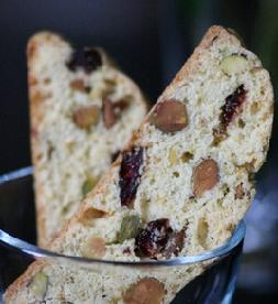 3,鸡蛋加糖用搅拌器打到鸡蛋液呈淡黄色,加入融化的黄油和香草精拌匀,筛入面粉,加入橙皮沫,开心果,红莓干拌匀。然后做成两条长度为12英寸,厚度大约为1+1/2英寸的长条。两条面团之间要保持一定的距离,否则烤的时候膨胀后会粘连在一起。