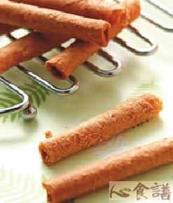 5.于蛋捲模上放约50公克的作法3小麦全谷蛋捲煳,盖上上盖约20秒后,翻锅面再10秒,再翻回来烤20秒,打开上盖,以铁捲棒和手辅助蛋捲捲起,即完成一支小麦全谷蛋捲。