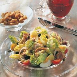 6.鸡蛋去壳,纵向切成4份。沙拉拌匀,尽量使每片莴苣叶都沾上沙拉酱。然后加入鸡蛋。炸面包块放在另一盘子中上桌。