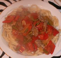 f.在面饧好前10分钟,锅中入油8成热,将拌好的牛肉过油至熟色,盛出如,再入油7成热加入洋葱、青红椒、西红柿、扁豆翻炒均匀,加入西红柿,番茄酱炒几分钟,再将炒熟的牛肉入锅再加入蒜末翻炒1分钟盐、鸡精关火,装盘即可。