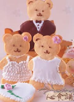 3.将作法2的面糰放入塑胶袋中,用桿面棍桿成约0.5公分厚的面皮后剪开塑胶袋,再用小熊饼干模型在面皮上面压出数个小熊形状,放入烤箱上层,以180℃约烤20分钟后取出待凉备用。