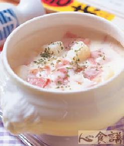 做法:1、将瑶柱、鲜虾、洋葱、豌豆苗切碎,倒入白浓汤中,...