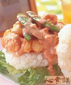 6.在其中一个珍珠饭糰依序舖上美生菜、作法3的干贝及甜豆,淋上作法4的美奶优格酱,再盖上另一个珍珠饭糰即可。