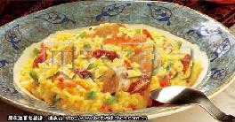 放入洋葱粒炒软后依次加入大米、少量泡藏红花的白葡萄酒和红甜椒粒,翻炒至酒挥发。加入蕃茄粒及少量鸡汤,翻炒至鸡汤挥发。不时重复淋入白葡萄酒和鸡汤的步骤,至大米表面发软,炒八成熟(此过程约需25分钟,一定要不停翻炒)。