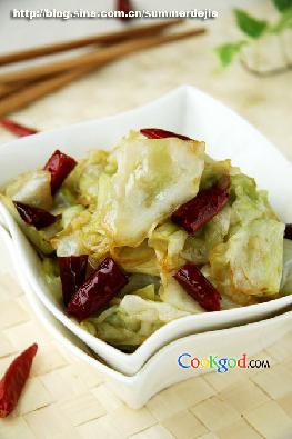 2、放蒜片之前关小火,放入卷心菜后,立即把下面的辣椒翻炒上来,防止炒过火;