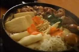 取出特富龙“睿晶”不粘汤锅,把白菜、香菇、青菜、胡萝卜片放好,再加入豆腐、牛肉薄片、粉丝,倒入调好的酱汁,开火,加入适量水,15分钟后装盆
