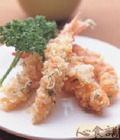 5.使用长筷子把浮在油锅表面的脆面粒集中在油锅边,改转中火,避免脆面粒过焦,迅速的将作法3的草虾沾裹上作法2的粉浆,放入锅中脆面粒的集中处炸,使草虾沾上脆面粒,待炸约半分钟至表皮呈金黄酥脆状,再捞起沥干油份,装盘佐以作法2的沾汁食用。