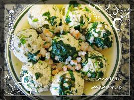 9)菠菜用开水烫(开水里加一点油,然后用冷水激,可以保绿),晾凉的菠菜可以镶嵌在豆腐球之间,也可以切成碎末放入勾芡中,像翡翠一样