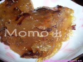 做法:1.将肥猪肉烙毛后刮洗干净,滤去水切成7厘米长、15厘米...