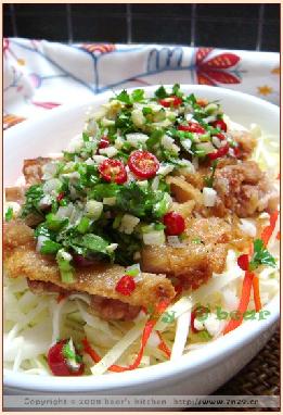 9.出锅后用吸油纸再吸收一下多余的油份,然后切成条状,排在包菜丝上,再淋上调料汁就可以了。