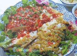 3、上笼蒸8~12分钟后取出,撒上葱花,周边加上香菜;色拉油入锅烧热,用调味料调味,淋在鱼头上即可。