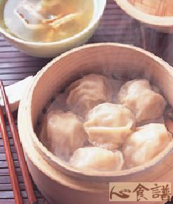 5.取作法4一面皮,于皮中填入作法1的馅料,以小笼包的包法与收口方式,将收口处捏紧后,将收口的地方倒扣放入蒸笼中,每笼放入20粒。