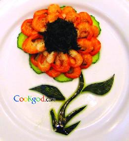 做法:1.把虾肉、韭菜、豆芽、洋葱、面粉、适量盐和食用色素...