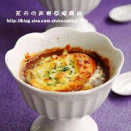 将汤装入烤碗里,在上面放一片烤过的面包片,撒上马苏。烤箱200度,烤10分钟即可。