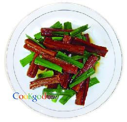 材料:调料:盐8克,鸡精5克,味精5克,白糖10克,水2千克,猪油10克,色拉油2千克,香油、葱油各3克。制法:1、将藕去皮清洗干净,高压锅中加入2千克水,加入盐、味精、鸡精、白糖,用中火压1小时,然后离火,30分钟后取出冷却。2、将藕切成6厘米长、0.5厘米宽的条,锅中加入色拉油烧至八成热,放入切好的藕条小火炸约1.5分钟至金黄色捞出,另起锅加入猪油烧至七成热,放入藕条,大火煸炒2.5分钟,放入青蒜段继续煸炒0.5分钟,淋入香油、葱油即可出锅装盘。特点:藕酥香回甜,色泽金红。备注:在选择藕时一定要选择含淀粉量大、长在深土里面的,这种藕