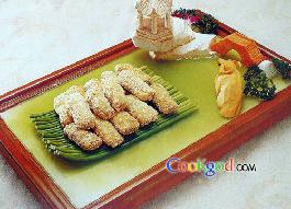 做法:1.将虾胶擀成长20厘米、宽12厘米的片,咸蛋黄揉成0.8厘米...