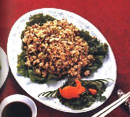 7.锅内留油50克,用旺火烧热后,放入葱、姜末,烹入香味后,迅速放入鸡肉末及配料,倒入芡汁颠翻,淋鸡油出锅即成。