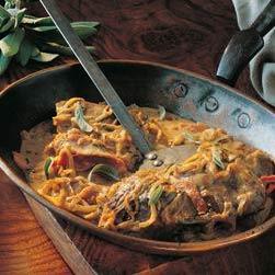 6.腌熏猪肉回锅,加入汁液,搅拌时刮起锅底沉淀物。煨煮3—4分钟。羊肝须煮熟而中央呈淡红色。