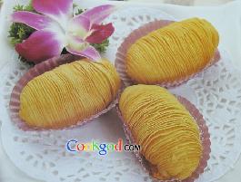 1、将面粉、猪油、黄牛油、糖加水擀成薄面皮后,对折继续擀匀,重复数次擀成层次状后,将皮切条;