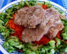 6, 将蒸熟的肉摆在酸甜的胡萝卜素,黄瓜丝上,就是一道很好吃的菜了。。