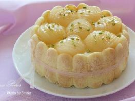 组装:手指饼围好,蛋糕片放入慕丝圈内,刷上酒糖液。将慕丝馅倒入1/2,把小洋梨