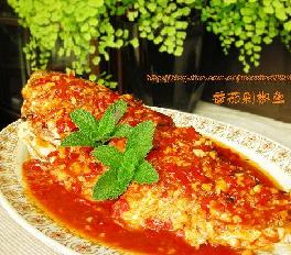 5、锅中留底油,分别加入姜末、蒜末爆香,加入剁椒、番茄沙司、糖、醋等调料,等酱汁在锅中冒起大泡时关火,将酱汁均匀的浇在炸好的鱼身上。