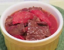二、番茄切滚刀块,锅置炉上,开中火,锅烧至三至四成热时放油,然后均匀的放牛肉在锅里,不要整坨地倒,要平铺在锅里;