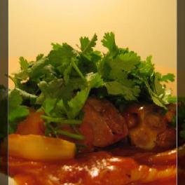 3、取一大锅置旺火上,干锅烧至极热,将全部鸡腿连酒一起倾入(听到哧啦一声巨响及看到众多白烟四起,属正常现象,不要恐惧)。大火烧煮至酒精基本挥发完毕,即锅中的汤基本不再有苦味时,加入适量盐和黑胡椒,扣锅盖,转小火,焖着。