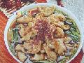 4.将泡好的熟羊头沥净水,切时,先将羊脸子(皮朝下)放在案板上,左手按住羊脸子,右手持刀,刀刃向外,刀背向里,倾斜成20°角,每隔1.5毫米距离片入一刀,片成较薄的大坡刀片。羊舌也片成同样的片。其他如羊眼睛,羊耳朵,上膛软骨(羊脑髓不切),均立着刀切成薄片。切片后,按不同部位分别盛入盘内,撒上椒盐(要现各异要撒,不然会使羊肉软塌无劲)即成。